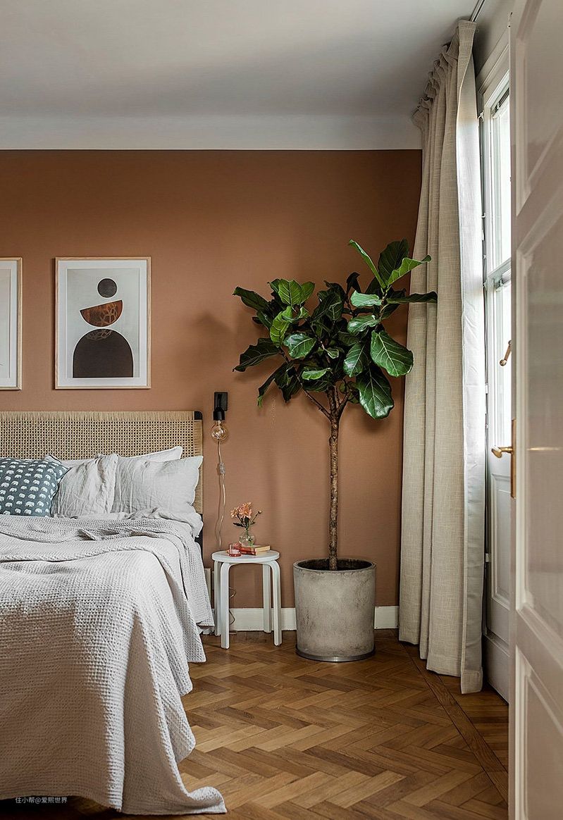 ▲ 赤陶色的墙面,不会太过于耀眼但是又很吸睛,有种来自沙漠的自然温暖感。用一张体积小巧,移动方便的圆凳来代替床头柜,加一盆高大的琴叶榕,就可以闻着绿叶香进入梦乡啦。