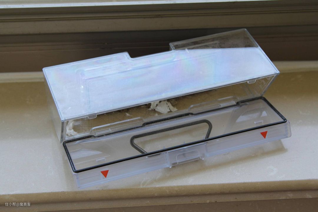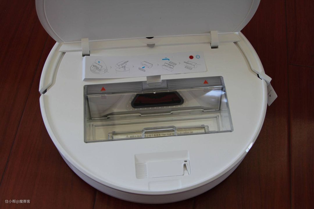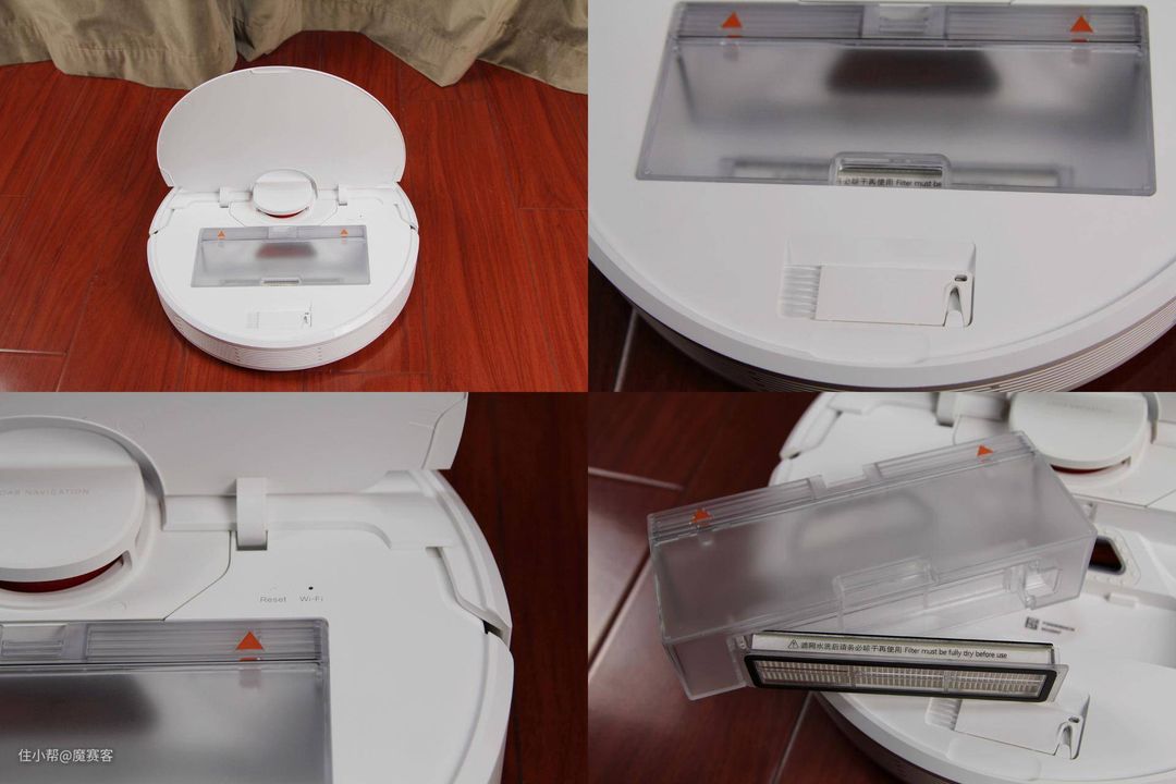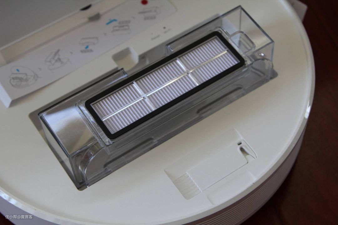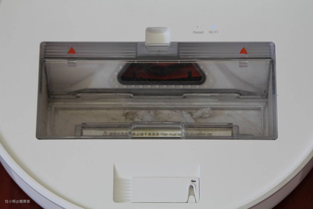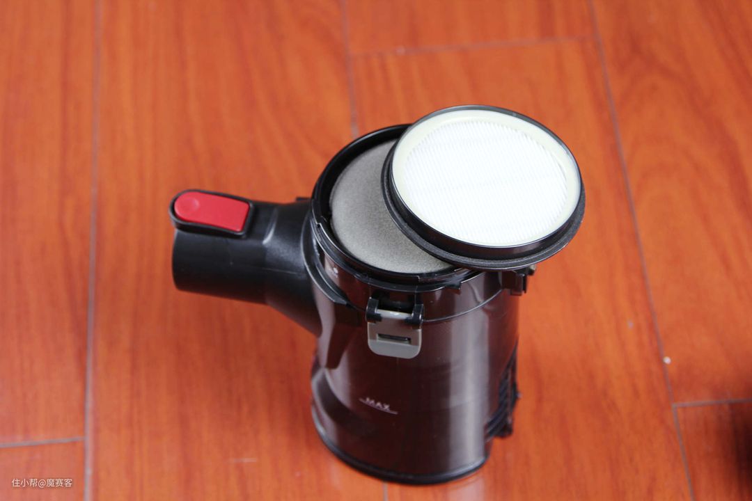 ▲尘盒不仅大,前端配备的双层精微滤网也很给力,0.3微米超强吸附能有效滤除微颗粒。