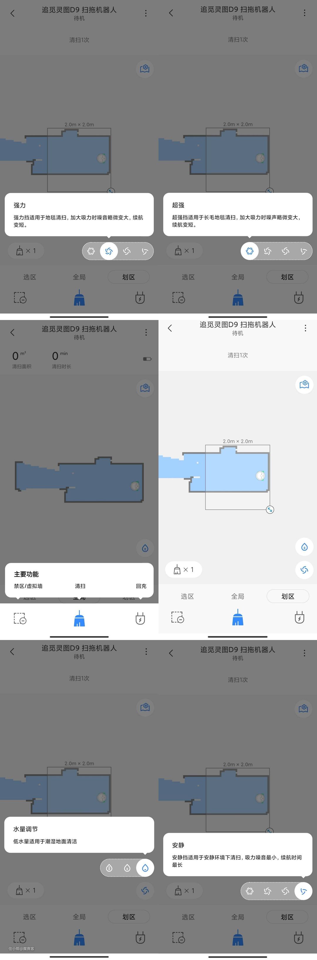 ▲通过APP,扫地机器人可以提供更精细的功能,比如控制吸力大小或者调节水量大小,如果地面偏潮湿则可以用低水量模式,而长毛地摊或者地摊则可以选择超强或者强力模式。