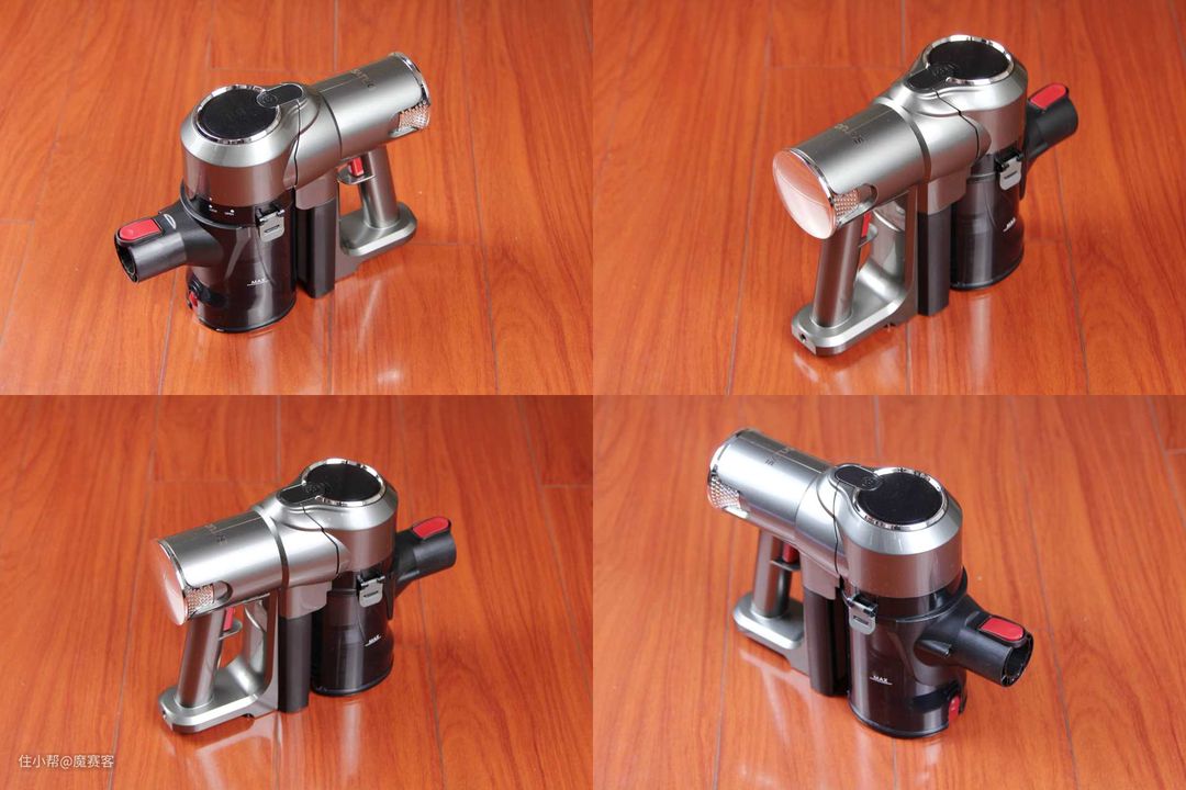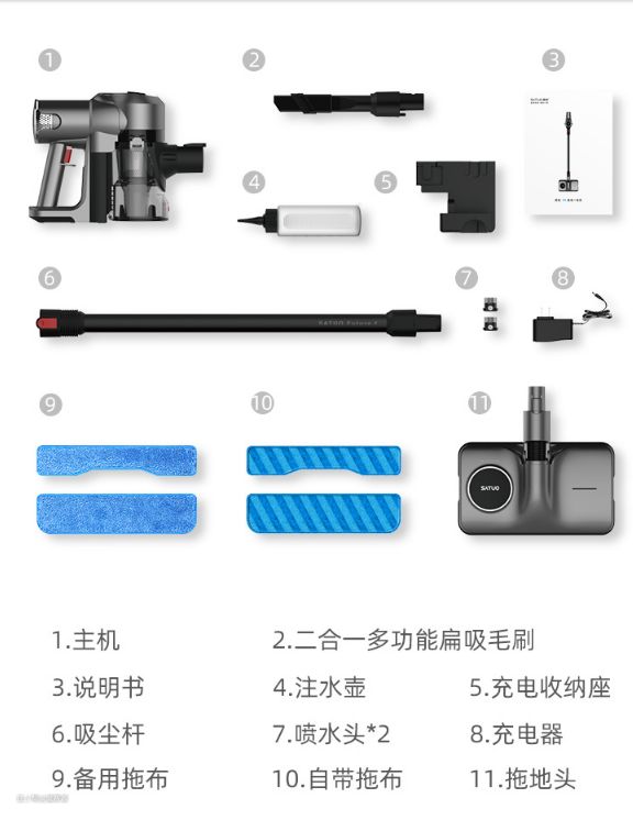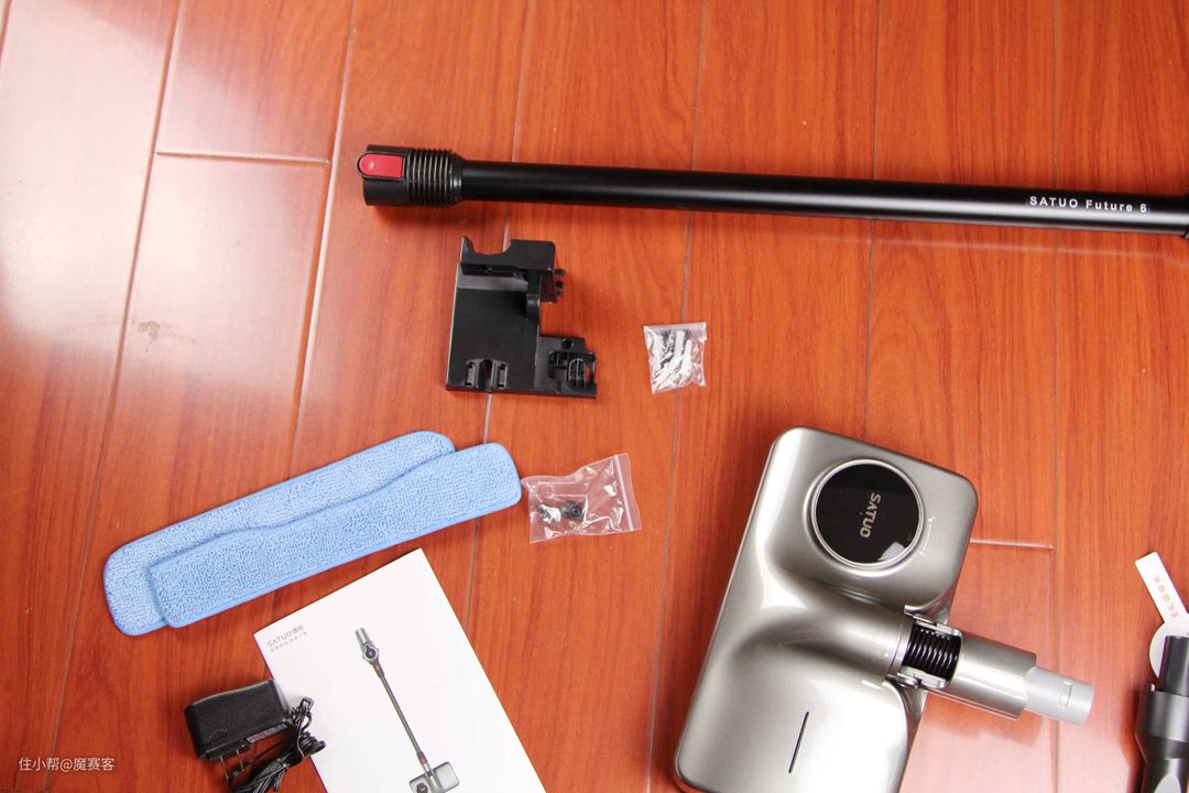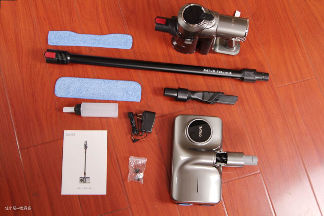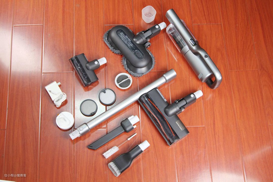 ▲看下全家福:除了吸尘器主机,还有电动除螨刷、宽扁吸、超长扁吸、尘杯、电源、磁吸充电器、滤网、滤芯、吸尘头、擦地头,几乎可以应付绝大部分家庭的所有地面清理了。