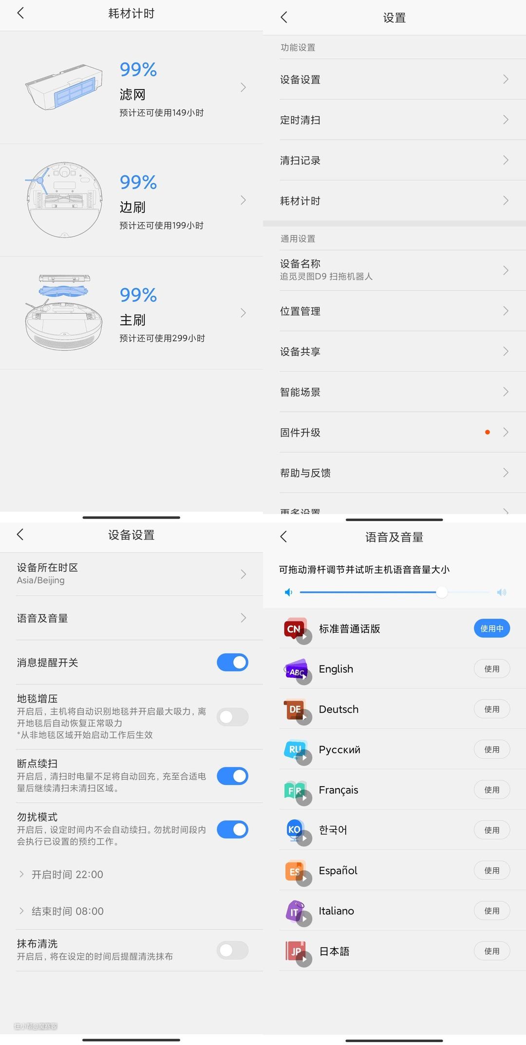 ▲与此同时,通过APP我们还可以知道滤芯何时需要更换,选择地毯增压或者断电续扫功能,也可以更换机器语音语言。