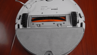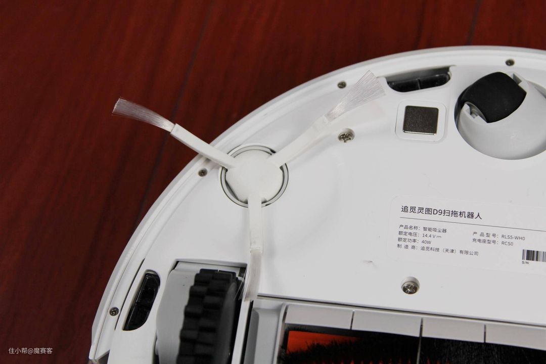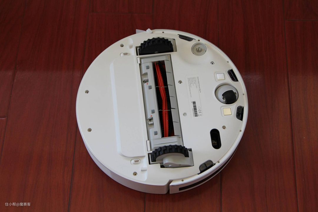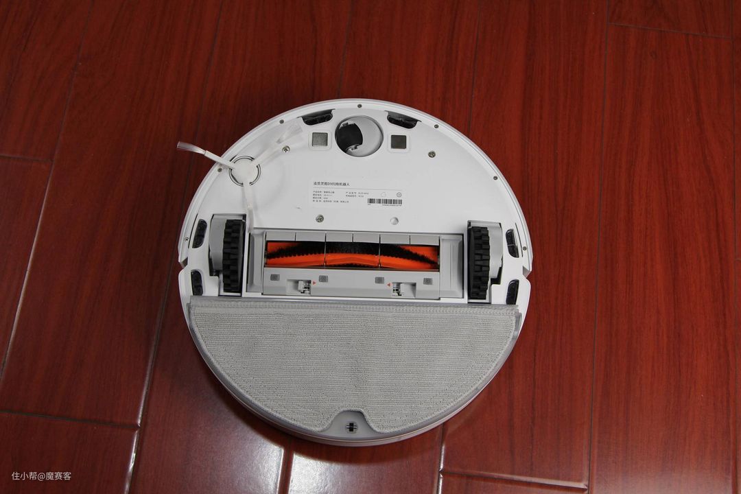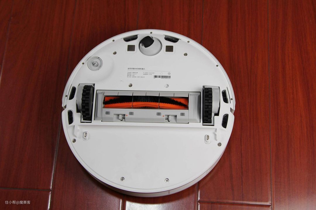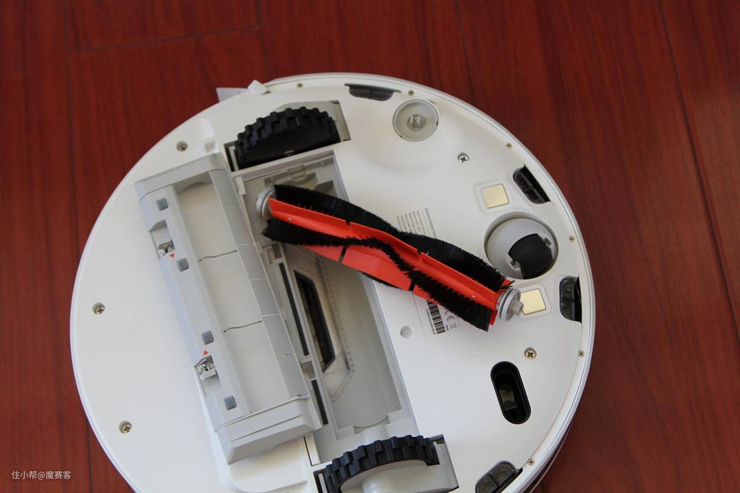 ▲看下机身底部,除了一个导向轮外还有配有两个越障轮,这个配置可以让机器人跨越一些移门之类的门槛;滚刷和旋转刷用来聚拢灰、脏物等。
