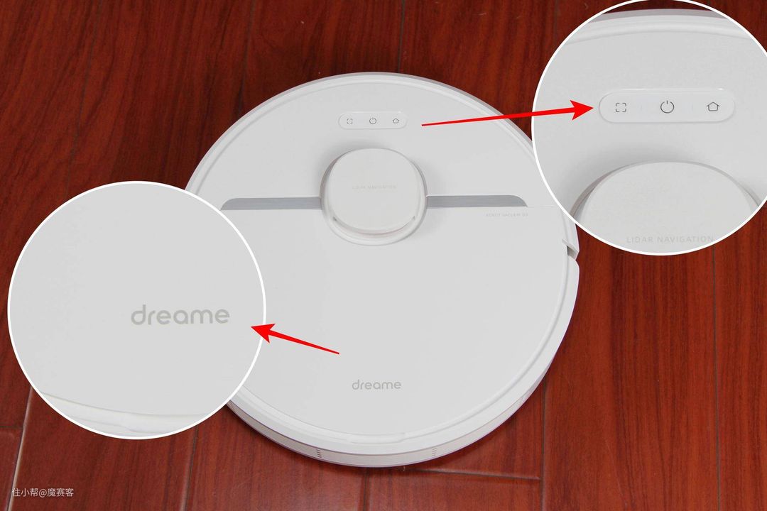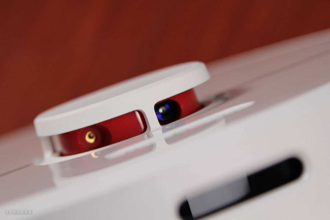▲上面箭头处为区域清扫,清扫和回充的图标;下面图标为追觅的英文LOGO。当中凸起的地方就是LDS扫地机器人的核心部件,激光传感器。