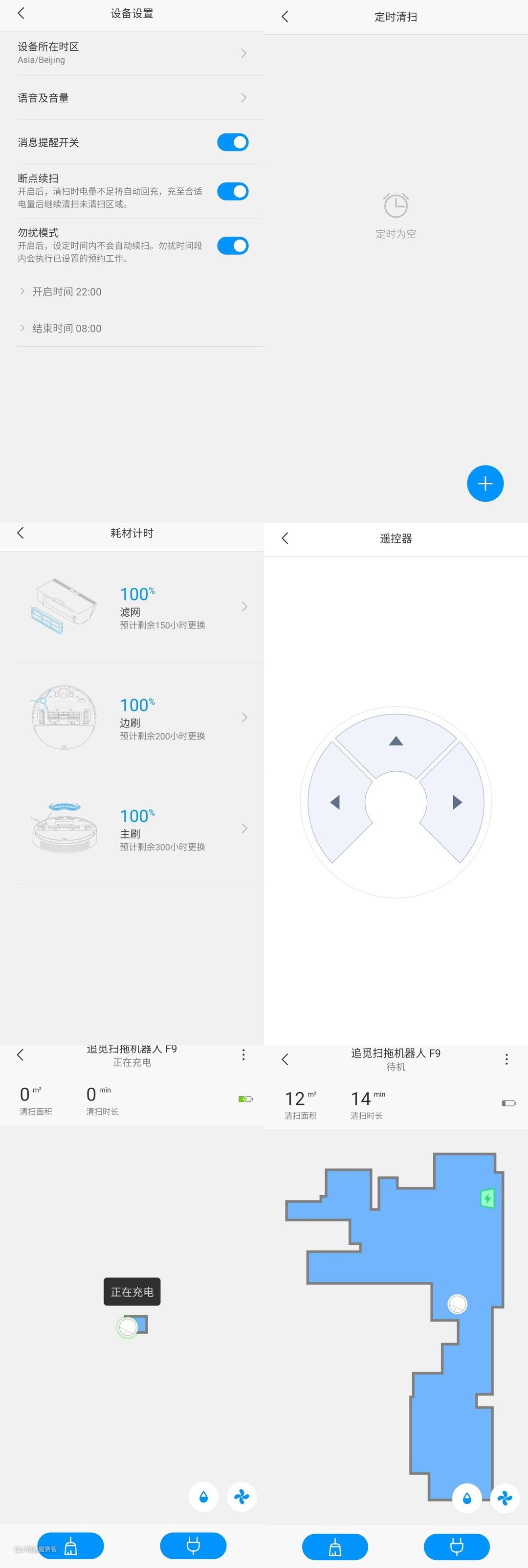 ▲通过APP我们还可以看到机器人的状态,清扫过的面积,滤网、边刷、主刷等耗材的寿命,甚至可以像遥控游戏机一样遥控机器人往哪里移动。