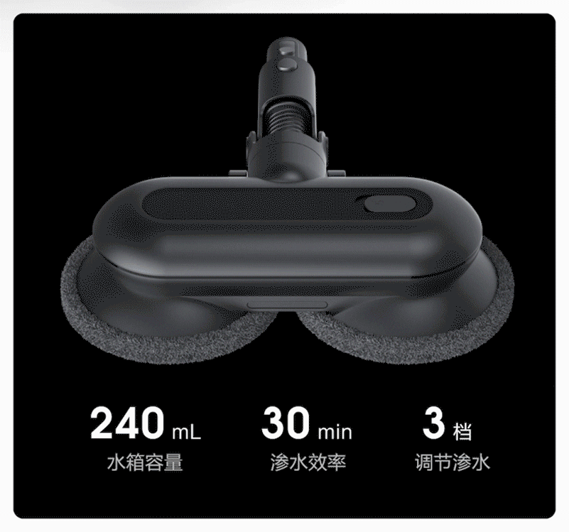 ▲出水口在前方中间位置,干湿分离式设计。粘贴式的拖布分为两段,超强粘力配合每分钟600次的高频往复式作业,对于地面上的粘留物有较好的去除效果。