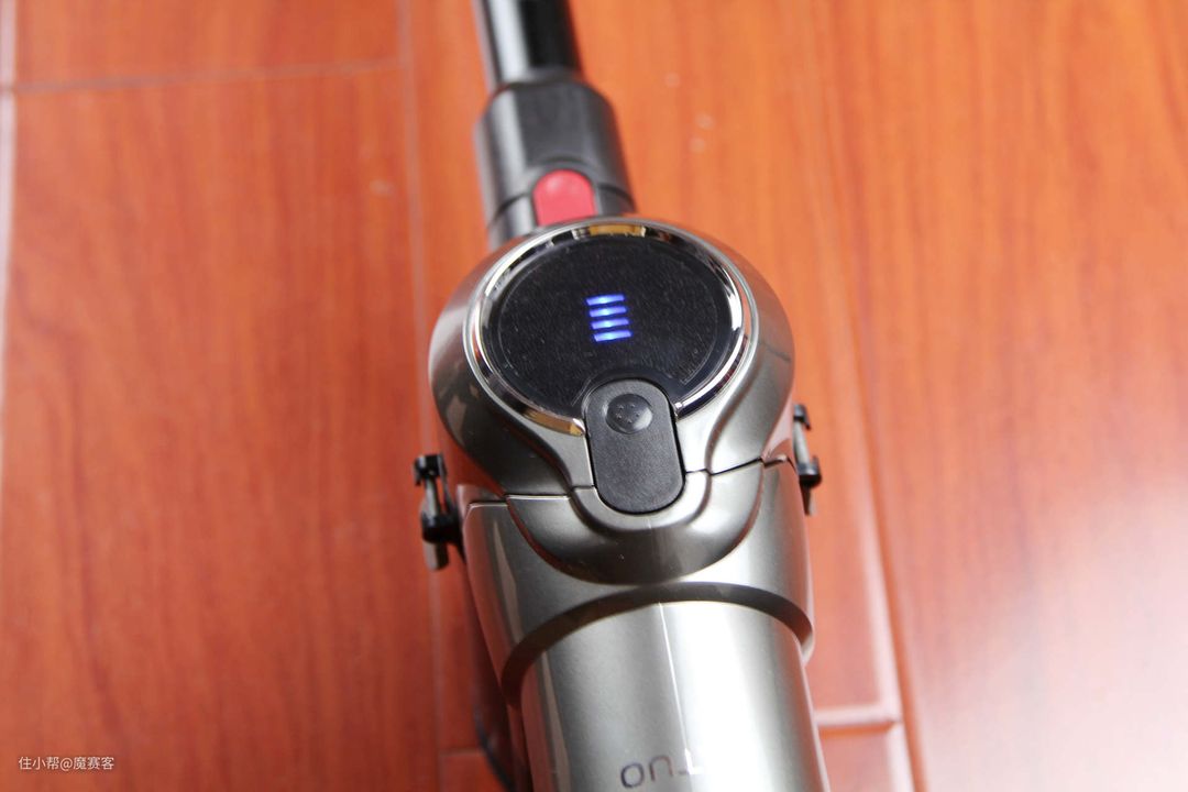▲主机采用了先进的Turbs无刷数码电机,其全新的增效动力方案,能让风量损失有效减小,并增大吸入功率,进而提供更大的吸附能力。红色扳机扣既是开机键也是高低速档的切换。握柄处斜角为特别设计的78°02′人体工学角度。