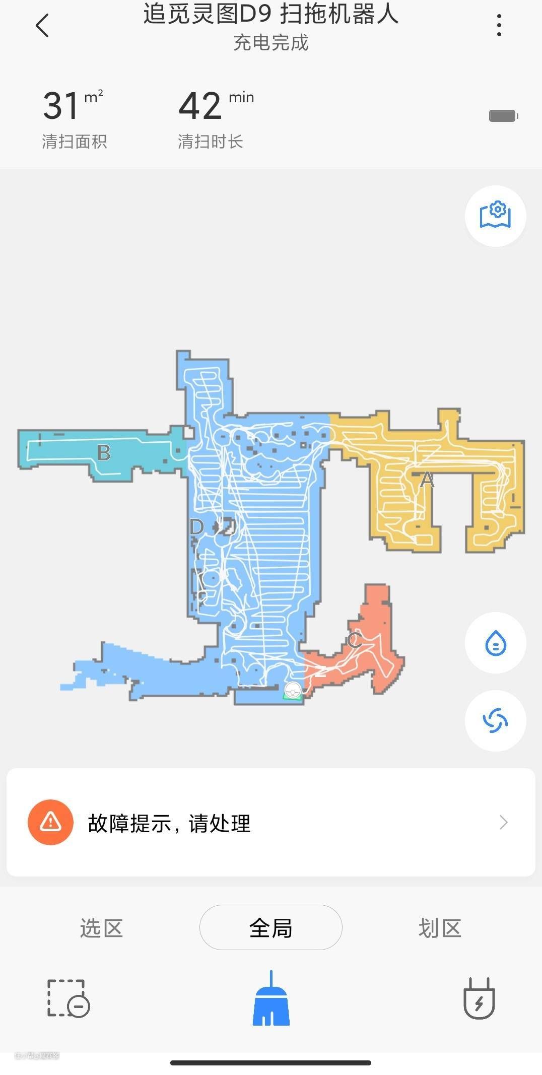 ▲得益于F9本身200ML的大水箱在200ML,对普通家庭来说绰绰有余,拖地效果如图令人满意,至少普通灰尘拖地完全没问题的。如果你真的要求扫拖机器人工作的效果卓越超过人类,我建议可以买一台机场用的那种拖地机器人,不过那种机器人是需要人驾驶的.......