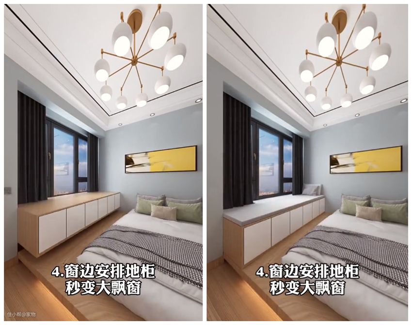 靠窗的一侧,可以用底柜设计飘窗,柜子内部可以收纳枕头、被褥等大件床品,而上面铺上一张榻榻米垫,就是一处完美的休闲空间,能坐能靠又能躺,在上面喝杯下午茶,美极了~