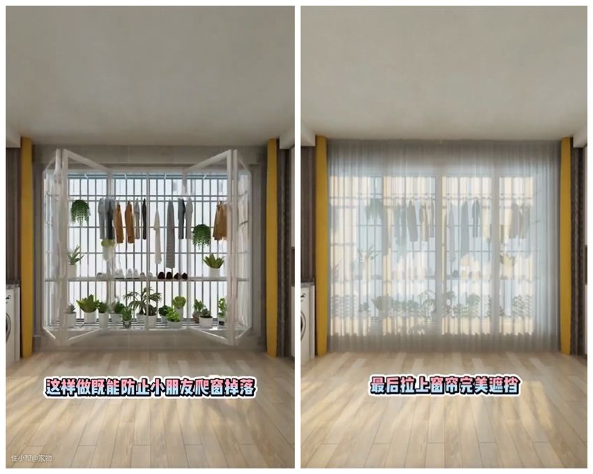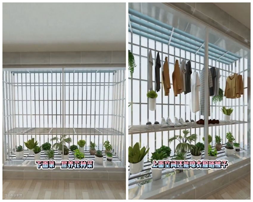 而后,下面一层可以养养花、种种菜,甚至冬天囤点儿白菜,都是天然的冰箱;而上层可以晾晒鞋子衣物,或者挂鸟笼之类的,收纳能力还是挺强的~