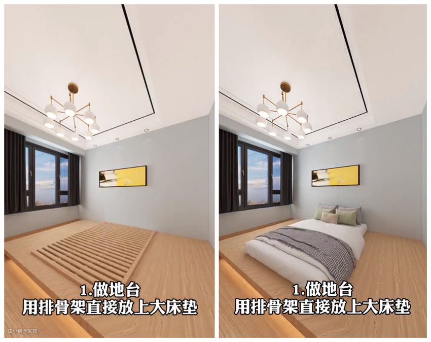只需要垫高地面做个地台,而后把床板直接放在上面的中央区域,再放床垫,就是一张标准的大床了~