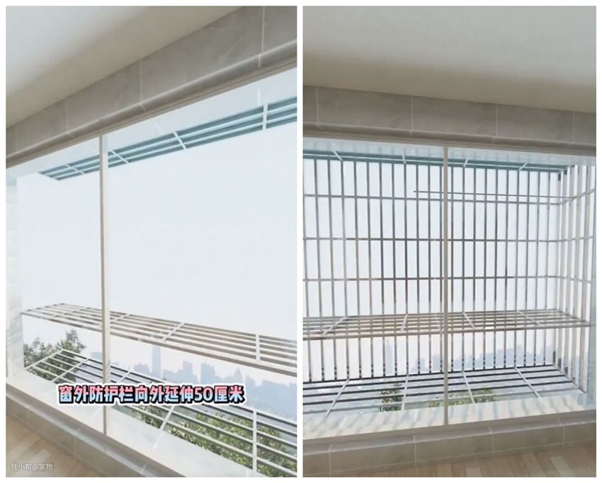 而后,用不锈钢将护栏外延50厘米左右,并包围起来分好层,可以把顶部和底部加装板材,避雨、防掉落。