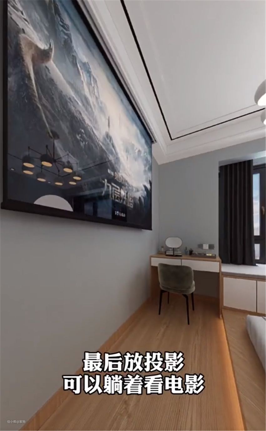 最后,我们还可以在正对床的位置设置幕布和投影仪,这样一来,卧室即可变成兼具休息、娱乐、收纳、工作、化妆的完备区域,而且空间也得到了充分利用,这样的设计还是非常不错的~