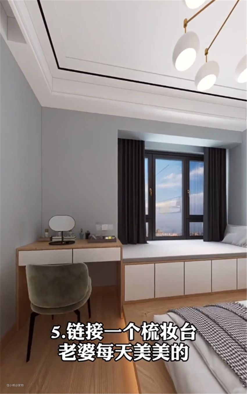 飘窗拐过来到床尾地台下面,可根据需求做梳妆台或者是办公桌,将室内角落空间填满,也能保证卧室的功能性。