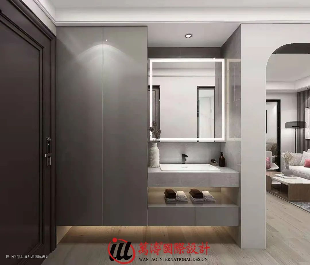 玄关进客厅的门洞做成弧形,与沙发背景弧形造型相呼应,沙发背景的储物柜做了格栅柜门,增加了层次感的同时满足了储物需求。次卧室门做了隐形门,与整面的木饰面浑然一体。