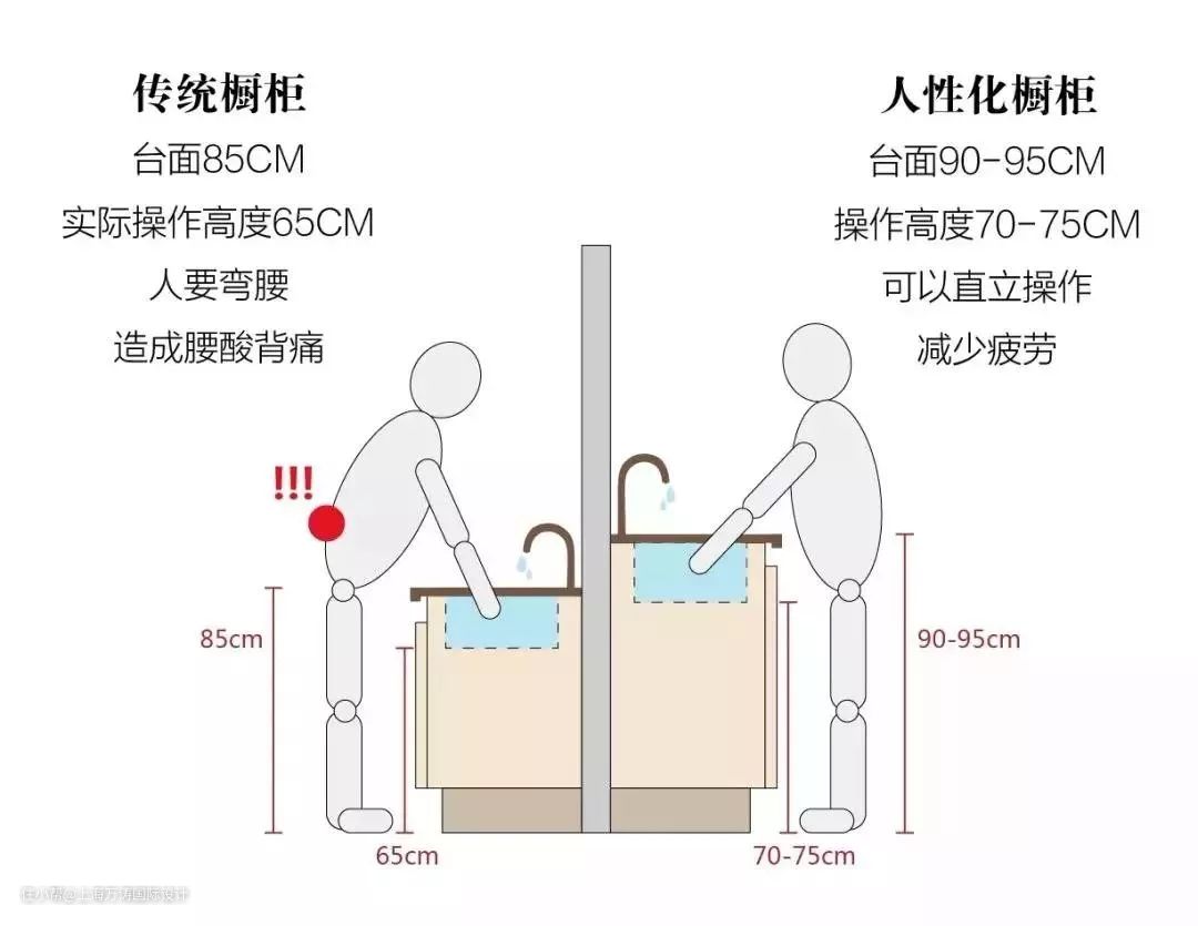 水槽台面与切菜台面通常要用到腰部力量,如果锅底,洗菜切菜会感觉腰部酸痛,那如何计算适合自己的舒适高度呢?