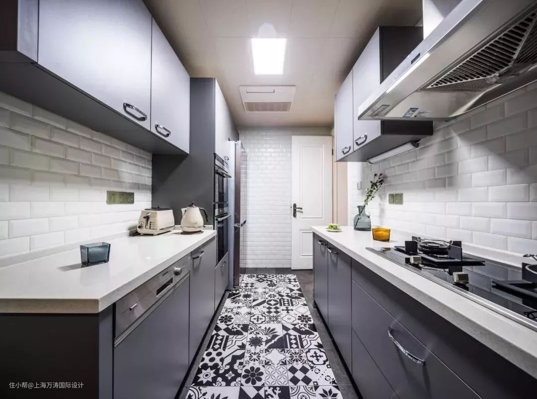 小提示:双线型布局对厨房的宽度有要求,除去两边的橱柜宽度,中间过道的宽度最好在90cm以上,让人有足够的空间弯腰取橱柜里的东西。