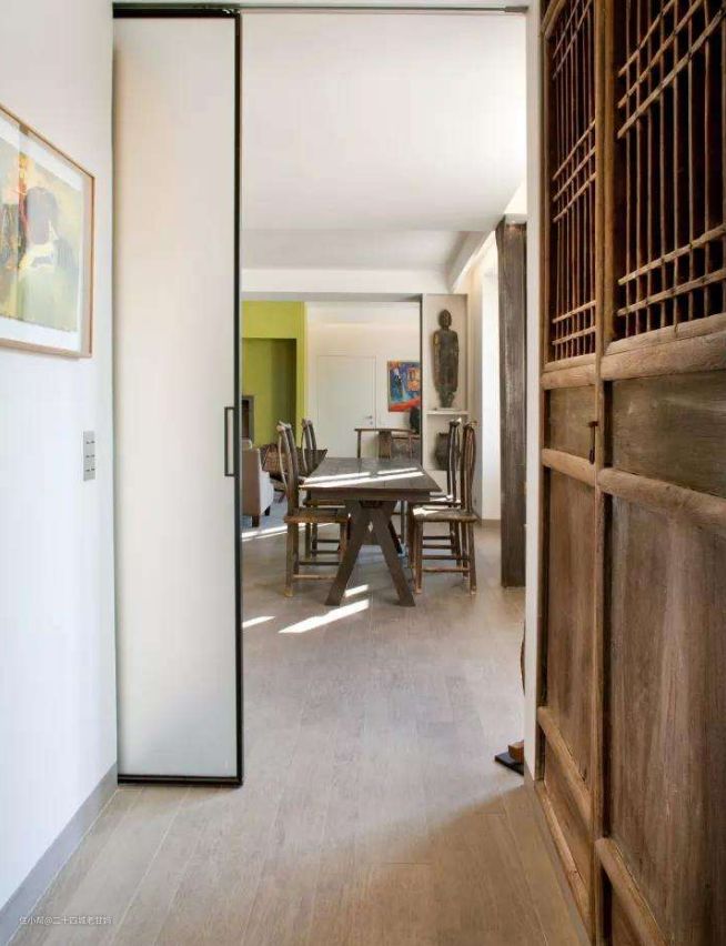 门扇全部藏进墙体当中,比起传统的推拉门来说更加省空间。还有就是,门可以全部展开,呈现的效果↓