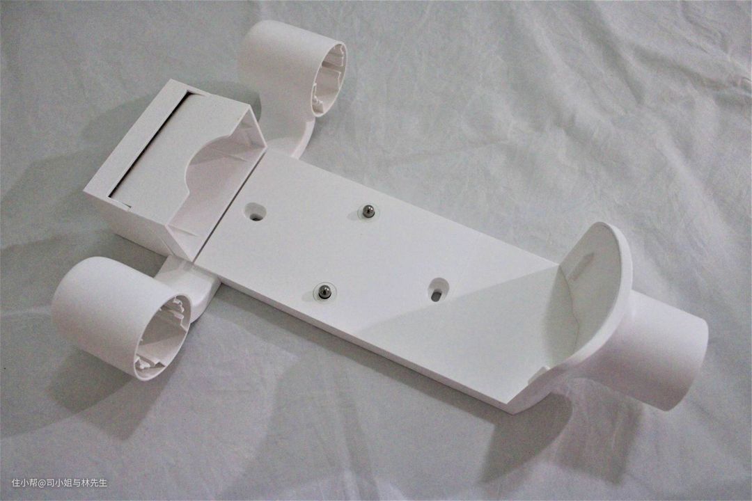 ▲最后一个部件是这个充电收纳二合一支架。顾名思义,就是安装在墙上,用来收纳吸尘器个部分组件,比较省空间。同时它的侧面有充电接口,吸尘器在放置不用时,通过收纳支架也可以充电,多功能体验还蛮好的。
