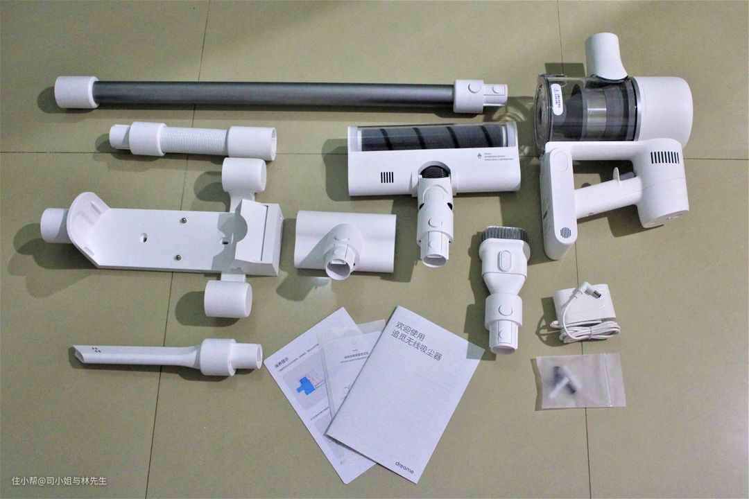 ▲拆箱过程有点复杂,因为每一个零部件都被硬纸壳包装盒和塑料包装袋进行了双层包裹,包材上很用心。里面包括:一个主机、两个连接管、四个吸尘刷头、一个充电收纳二合一支架、一个电源适配器、一包螺丝小零件、一份指导手册、一份使用说明书、以及一份安装定位贴。吸尘器整体外观呈白灰色,是干净简约的现代家居风格。