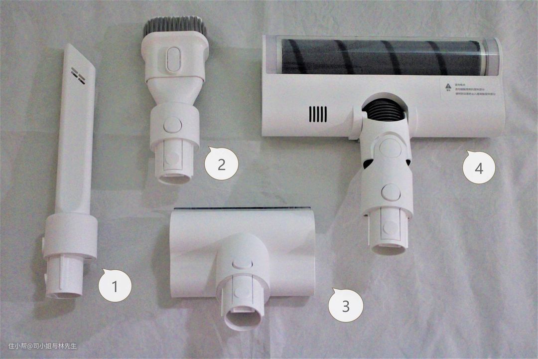 ▲四种除尘刷头各司其职:1-缝隙吸头,适合抽屉四角、拉门缝除尘;2-二合一毛刷,清理键盘缝隙很好用;3-电动除螨刷,清洁被褥时,还有除螨的功效;4-软绒滚刷吸头,吸附大理石、地板等大颗粒灰尘。