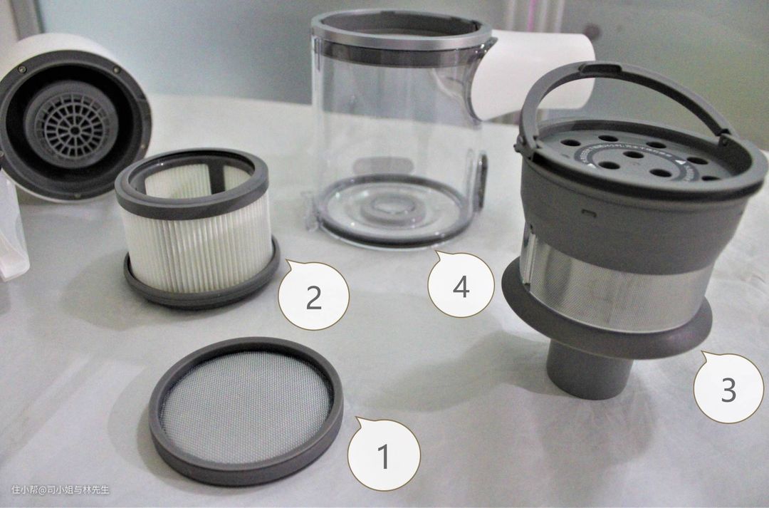 ▲费了半天力气把过滤网组件拆开,里里外外能拆的一共有4个部分:1-前置过滤网、2-HEPA滤网、3-旋风系统组件、4-集尘桶。