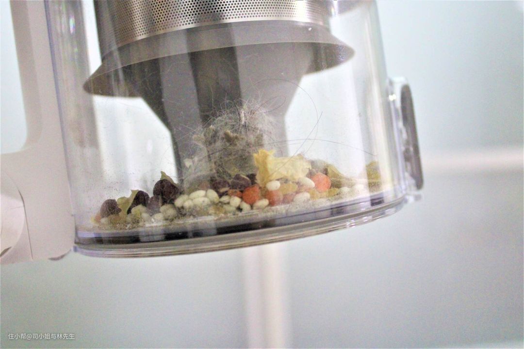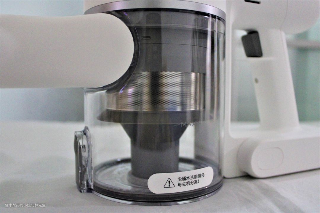 ▲灰色透明的塑料罐则是过滤集尘组件。透明的集尘桶容量有0.6L,比老款美的吸尘器的集尘桶大了很多。