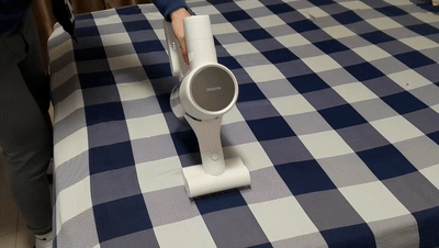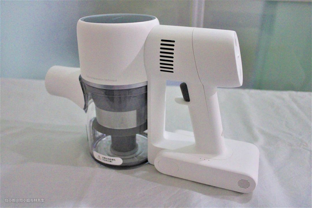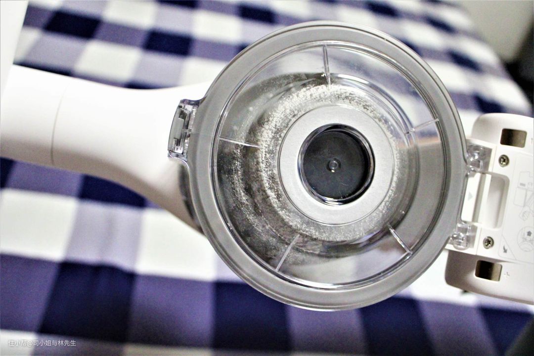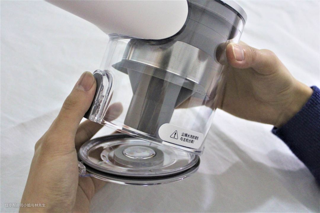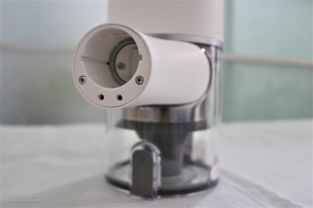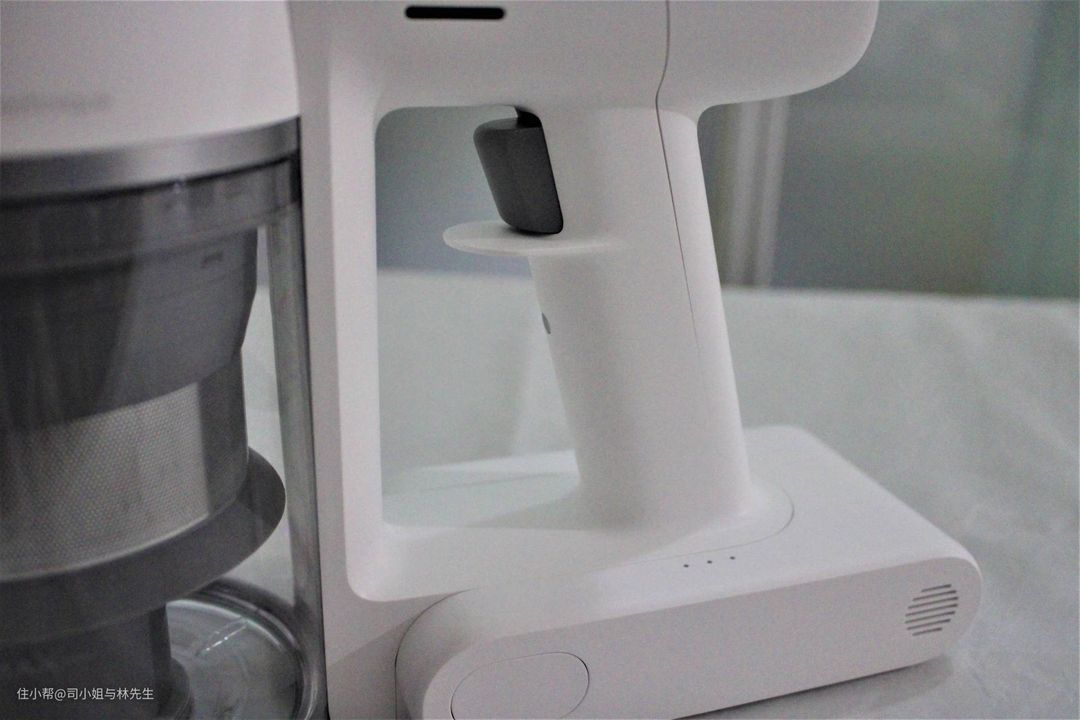 ▲集尘桶是底部加盖设计,按下释放按钮,底部盖子自动打开,灰尘自然下落到垃圾桶,双手就不用沾染灰尘了,这一点还蛮喜欢的。在清洗集尘桶的时候切记要先与主机分离开,卸下来单独清洗,以免漏电。