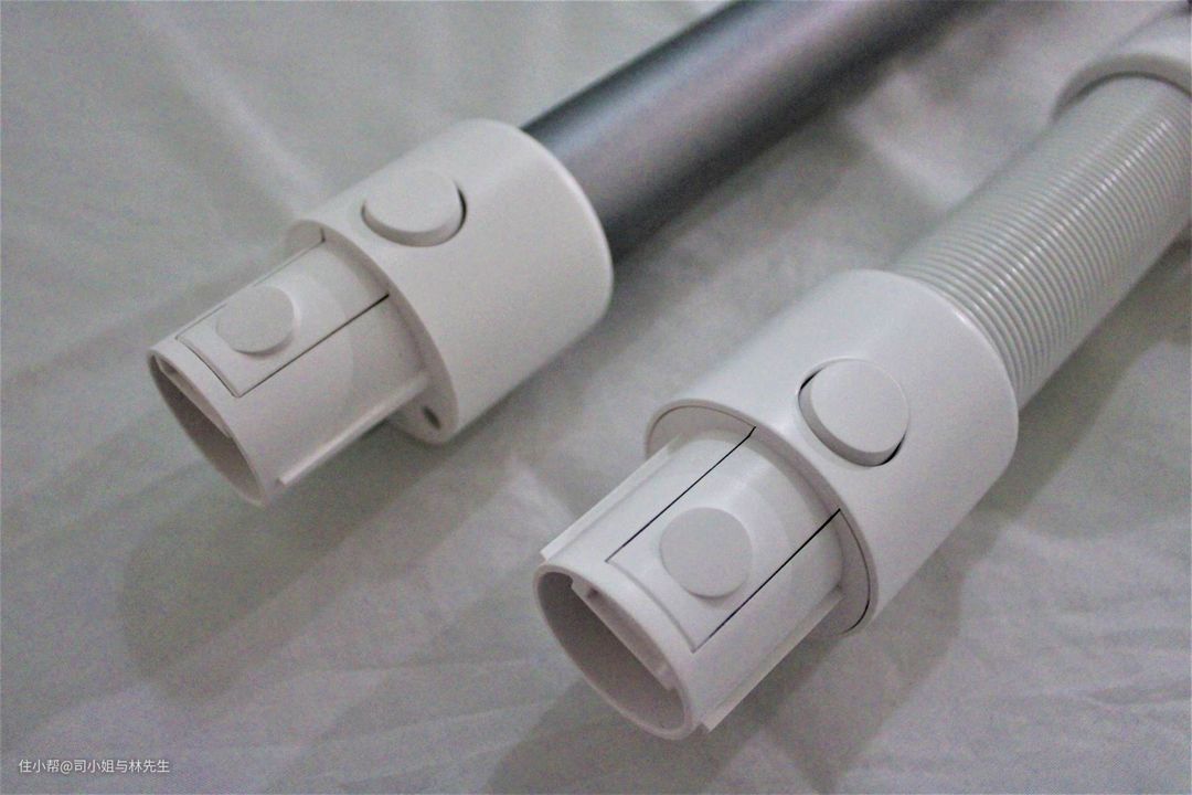 ▲较长的连接杆是金属材质,灰色蛮有质感的。另一根延伸软管在清洁死角的时候,更加灵活好用。