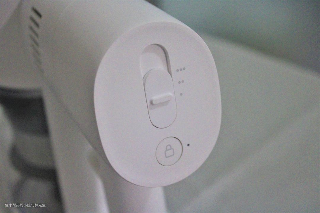 ▲电子锁键在手柄的上部。另一个开关按钮是调速按钮,旁边的三排小圆点表示三种不同的工作模式。一个圆点为持久模式,吸力相对最低,吸尘时间最长;两个圆点为强劲模式,吸力强劲,吸尘时间相对缩短;三个圆点为超强模式,即吸力达到最大真空度20000Pa,但相对的吸尘时间就比较短。
