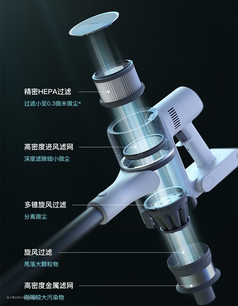 ▲其中,旋风系统组件还内置了一个12锥旋风分离微尘的组件,它利用超强的离心力将灰尘进一步过滤甩入高密度金属滤网中。吸入的灰尘要经过这5层过滤才能到集尘桶中,过滤的精密度是值得称赞的。