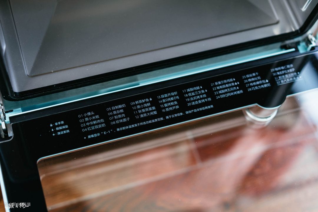 玻璃面板内部竟然也暗藏玄机,内置菜肴烹饪程序的编号都写在上面,懒得看食谱或者手机的时候,直接按照内置程序设置即可。