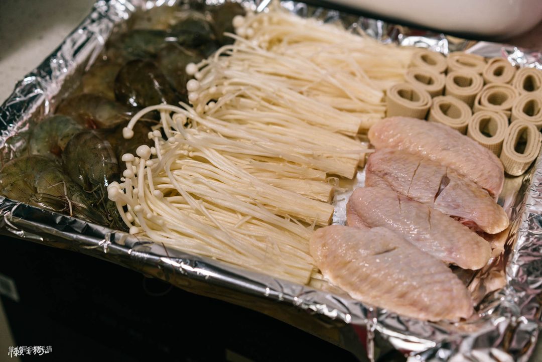 食材方面选用的是虾、金针菇、鸡翅、豆皮。