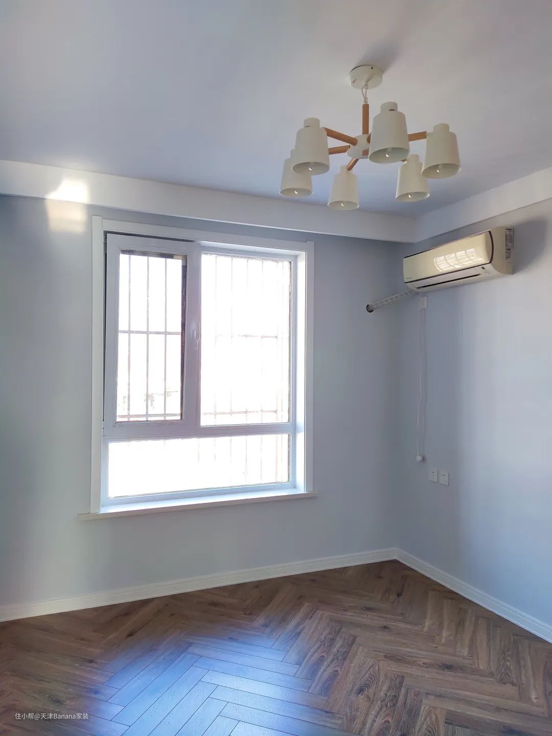 次卧选择了蓝色墙面,搭配白色吊灯,北欧风十足。地板与主卧相同,通铺时尚人字拼地板。