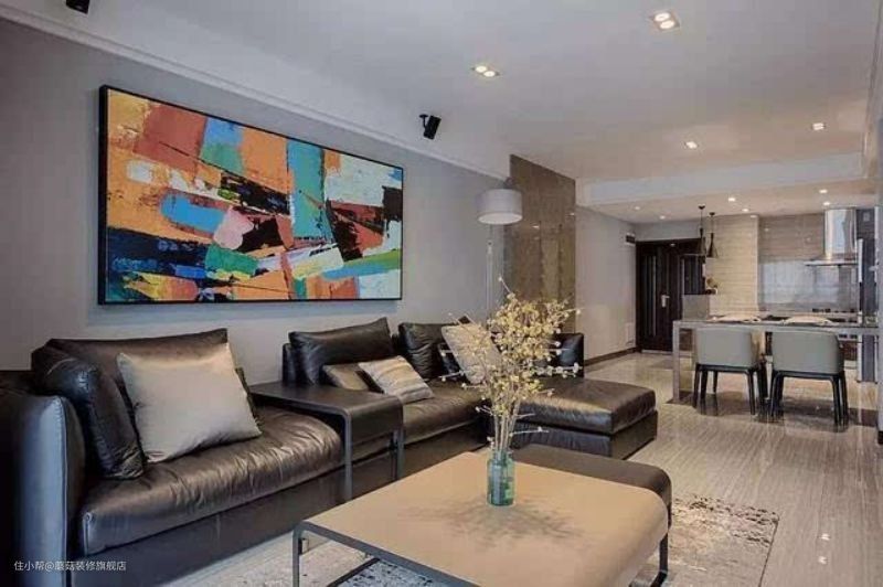 黑色皮质沙发款式有点特别,在正位中间加设茶几,看电视喝茶嗑瓜子更方便了,哈哈~~~沙发墙抽象彩色挂画,烘托出热情洋溢的氛围。