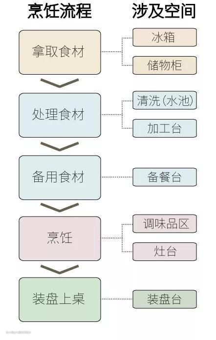 厨房动线就是你做饭时在厨房的运动路线。平时做饭我们基本需要以下流程,只有根据动线和做饭流程的需求,才能规划出最合理的厨房布局。