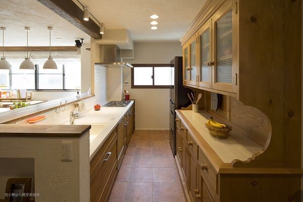 二字型厨房适用短粗型厨房,操作台平行分布,工作分区灵活性强。