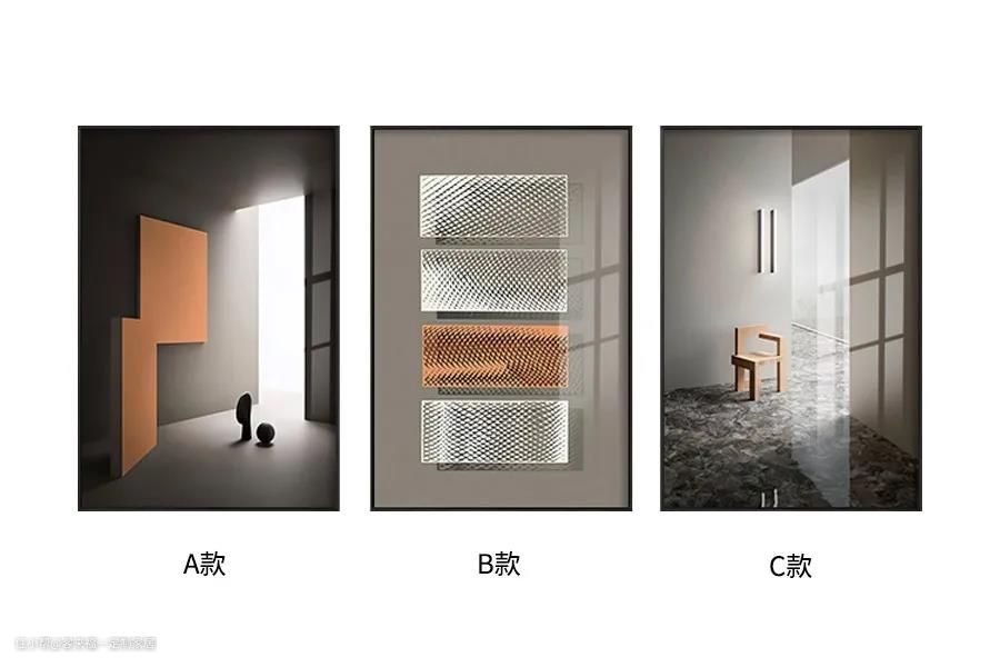 装饰画有千万种,在选择装饰画的时候要与空间整体风格统一,从色彩、图案到画的材质都要考虑到,如果你家是北欧风格的,就不要选择偏中式的花鸟图案,应该选择具有现代感的极简风装饰画。