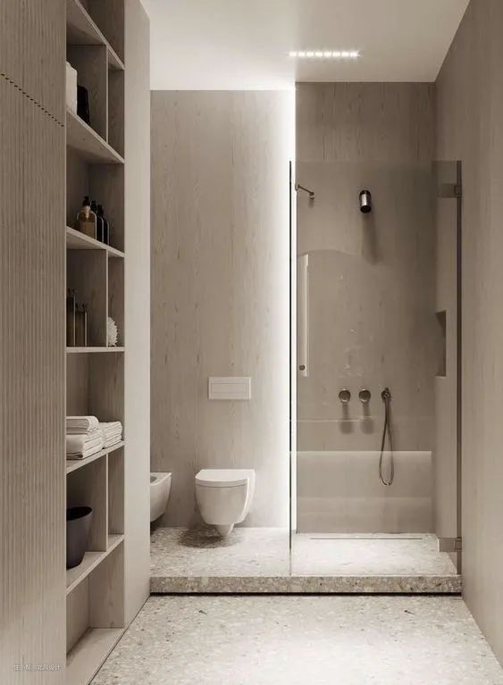 四分离卫生间比三分离多出一个家务区的设置,洗衣机烘干机和收纳单独划分一个区域,这样的设计对空间要求更高,但使用确实更加方便。对于极简设计来说,为了使空间更加整洁简约,一个单独的家务区非常重要。