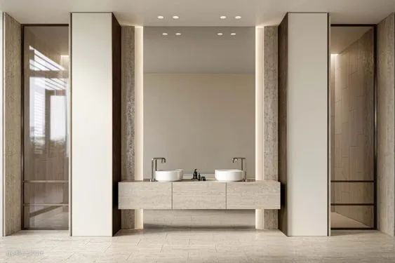 卫生间内由于管道、风道等因素,空间常常会出现很鸡肋的死角,可以将这些位置设计成壁龛,在硬装过程中设计出收纳空间,比起后期放置收纳柜更适合极简主义的格调。