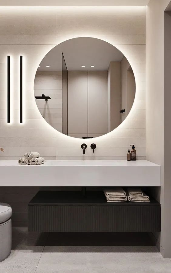 与镜面一体的氛围灯更加简洁,可以轻松调控卫生间的灯光氛围,镜面加热可以保证镜面不会因水汽而模糊。