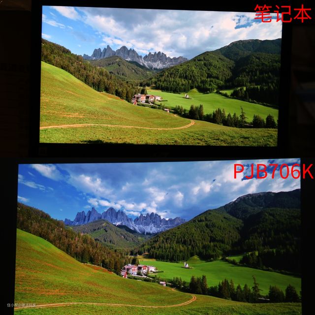 对比PJB706K的画面输出与笔记本的画面可以看出,由于PJB706K色域更广,整个画面让人看起来更舒服,色彩更丰富。如第二张图,笔记本的画面色彩偏单薄,PJB706K画面天空更蓝,画面色彩更显自然。