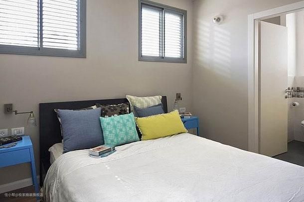 非常简单的卧室装修,蓝黄灰的搭配让空间显得更加的和睦温馨。床头两扇百叶窗户,能很有效的补充光线,对称的两个床头柜增加了空间的平衡美感。就是这么简单又干净的卧室,没有太多装饰元素。