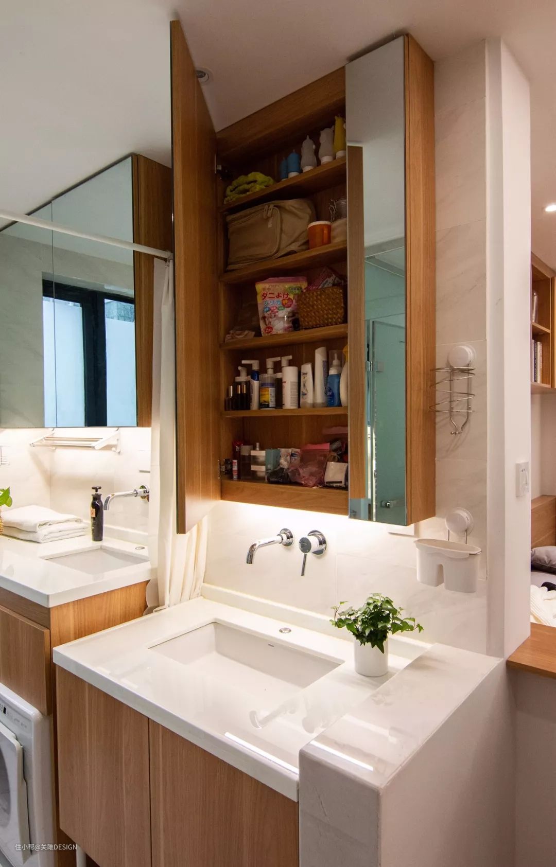 或则就是把镜子和柜子给组合在一起,这样的好处是不用每次打开镜子来拿取东西,但储物空间通常都会比较小一些。