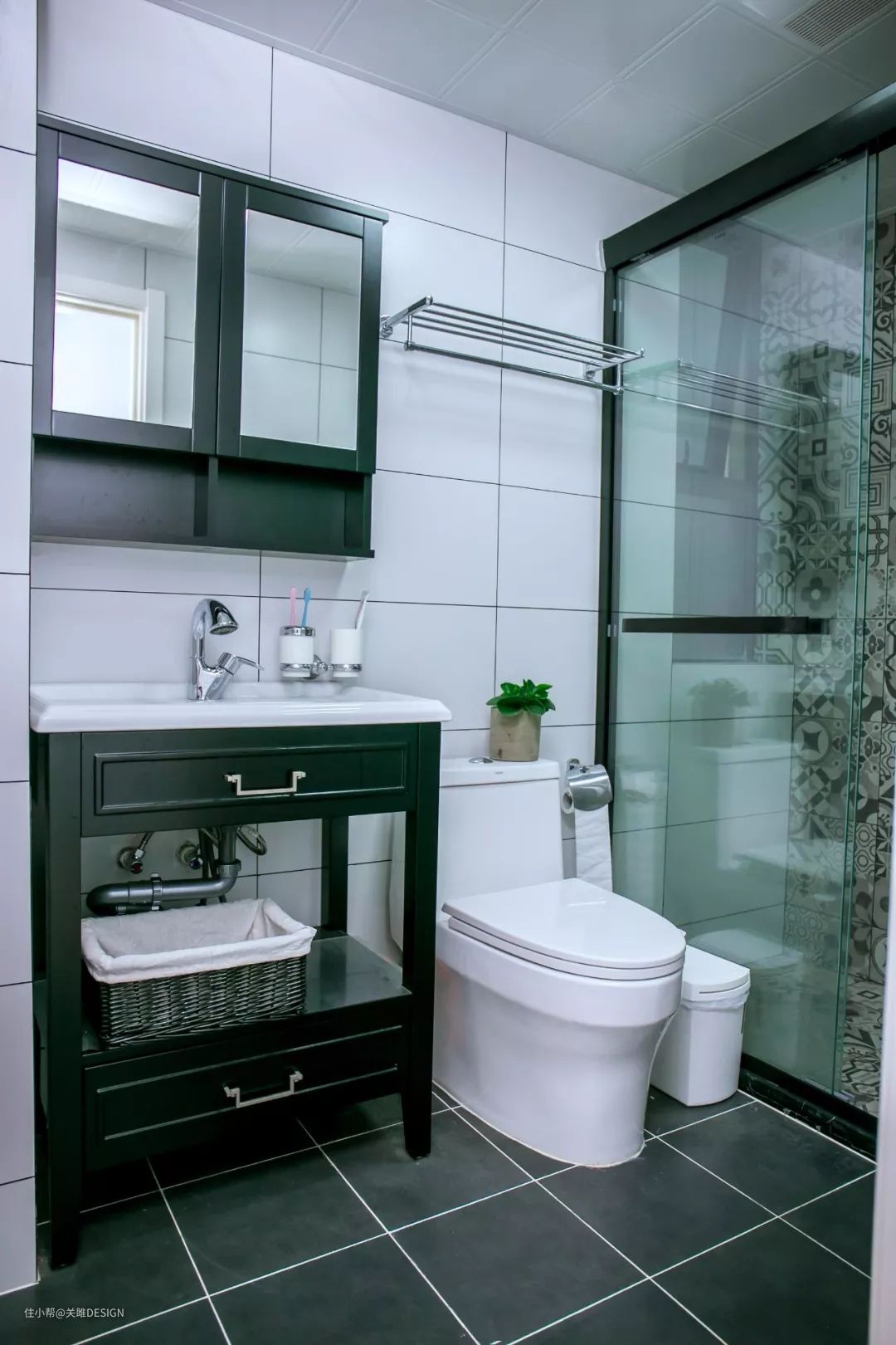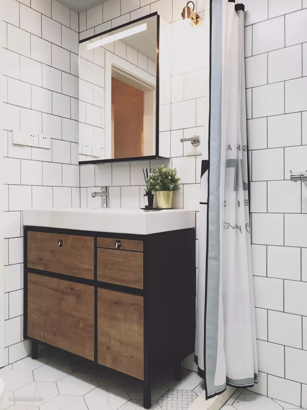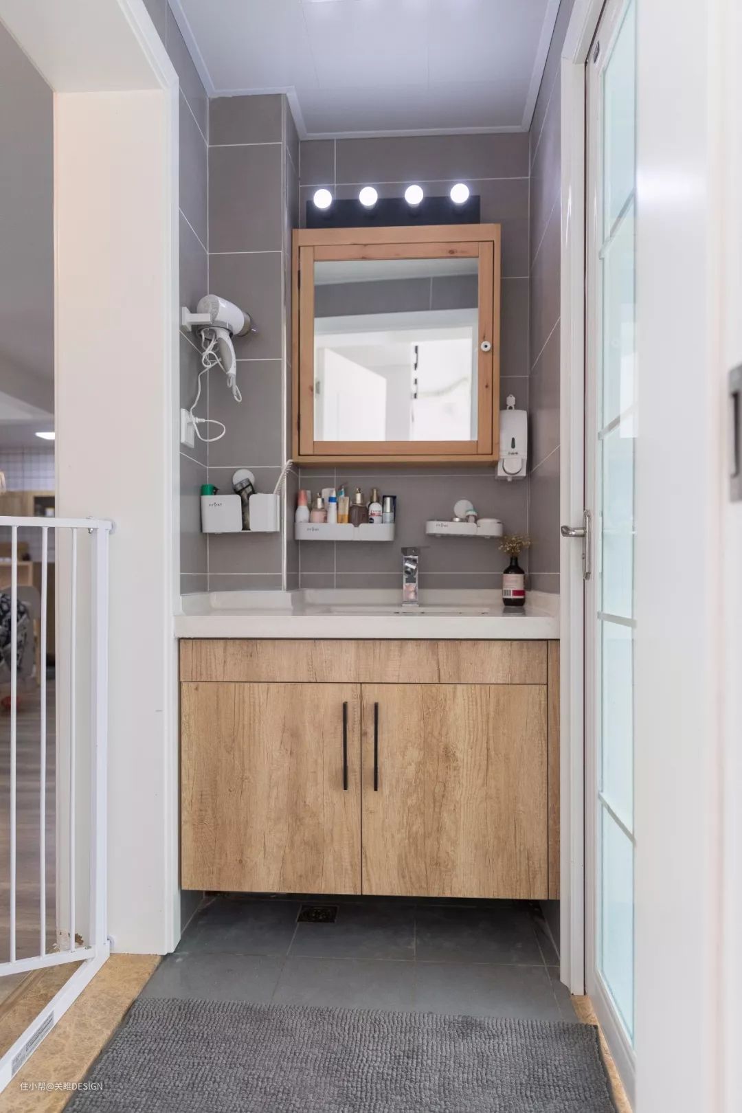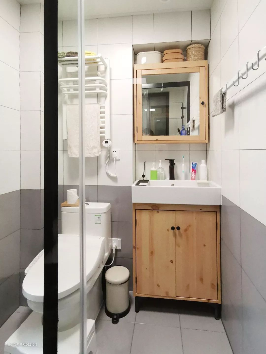 镜柜周边的墙面空间也是可以利用起来做收纳的,比如一些壁挂的置物架,用来摆放一些常用的洗漱用品还是很不错的。
