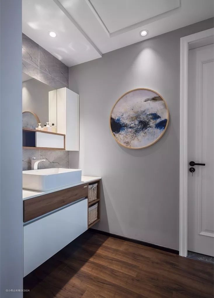 镜柜也是有着其他不同的款式的,比如在镜柜的下方留出开放式的格子,这样就不用额外去做太过的墙面置物架了。