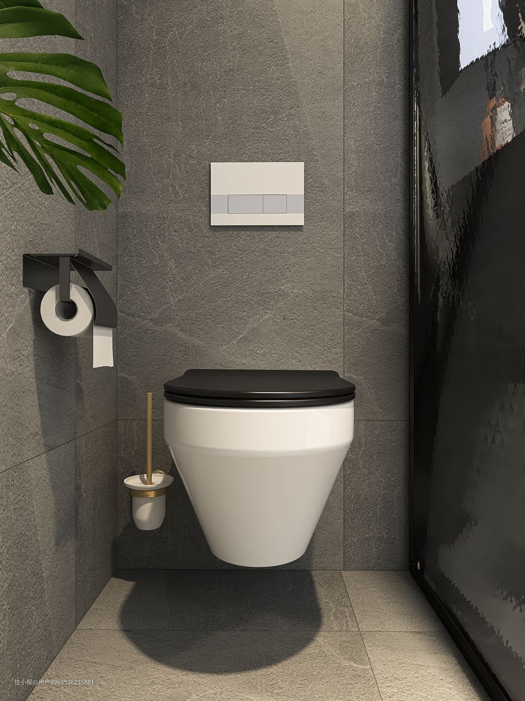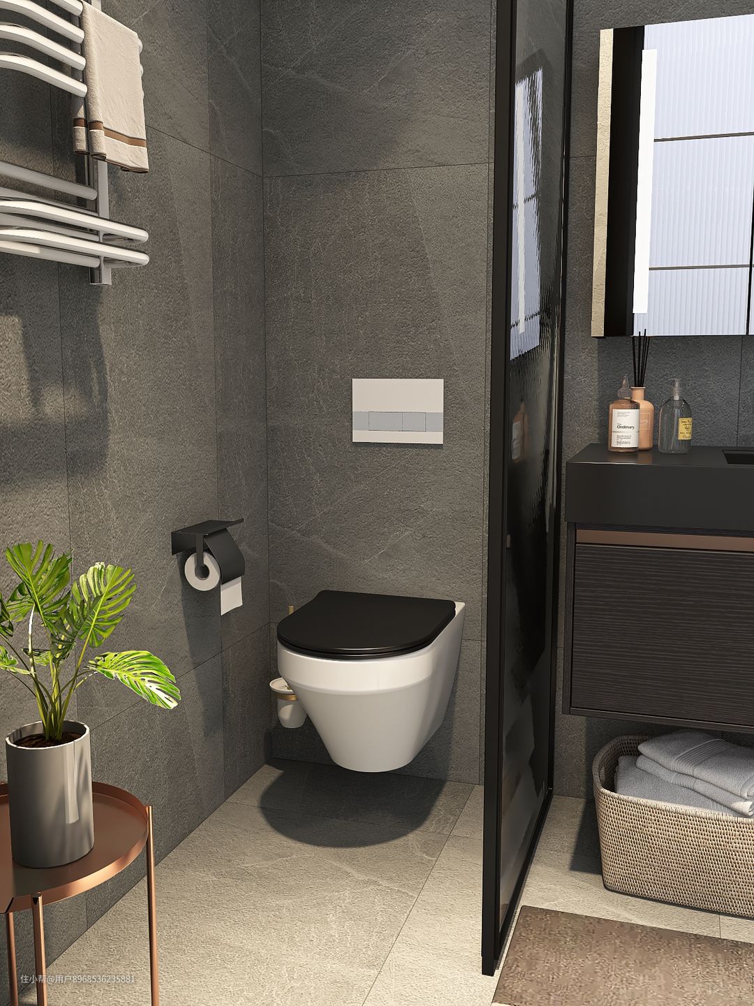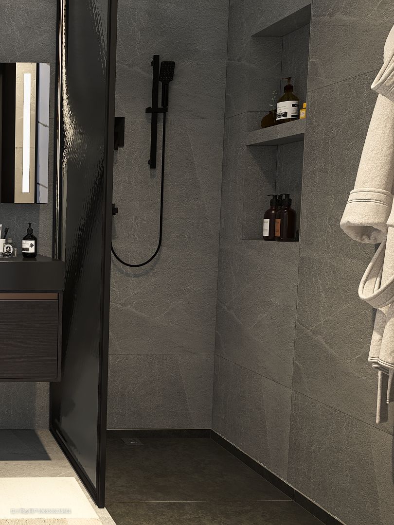整体色彩以黑白灰为主调,墙面和地面都贴了灰色瓷砖,搭配哑光黑入墙花洒和黑色盖板的壁挂马桶,看起来高级感满满。