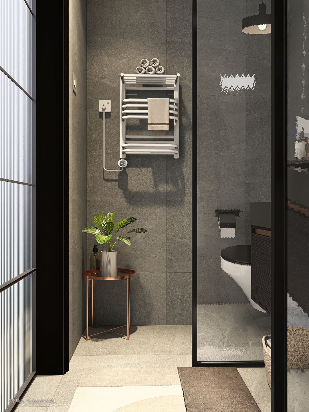 马桶选了滨芬壁挂式马桶,水箱入墙节省空间,下方悬空好打扫。旁边空白墙面放电热毛巾架,平常可以烘干毛巾浴巾,梅雨天还能烘干内衣,非常实用。