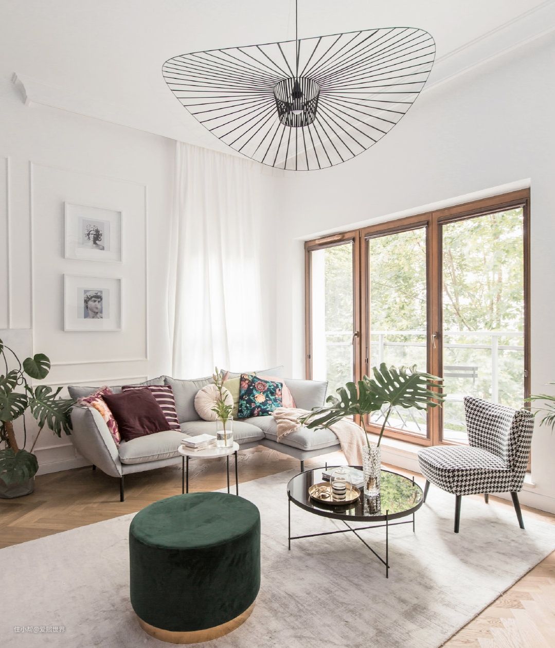 ▲ 客厅区域看起来非常素雅洁净。满足回归自然心理需求的绿色软装,高级灰白色沙发地毯,优雅的淑女帽灯,多层次的颜色汇合富有感染力又很别致,视觉上非常舒服。