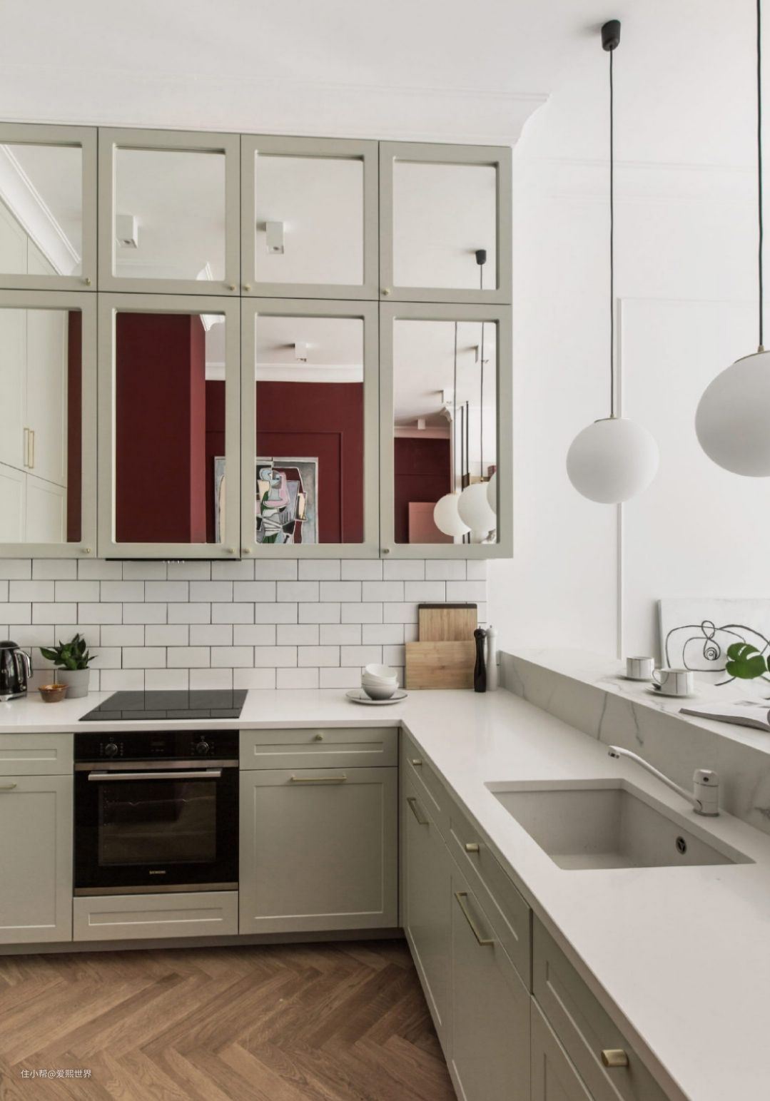 ▲ 白中带一点点绿调的橱柜,简约设计的球形灯,独特的镜子柜板,使厨房空间更加亮堂。而红墙映在柜子上,给空间增加色彩的同事,提升了这个角落的积极情绪,带来更多开心的能量。