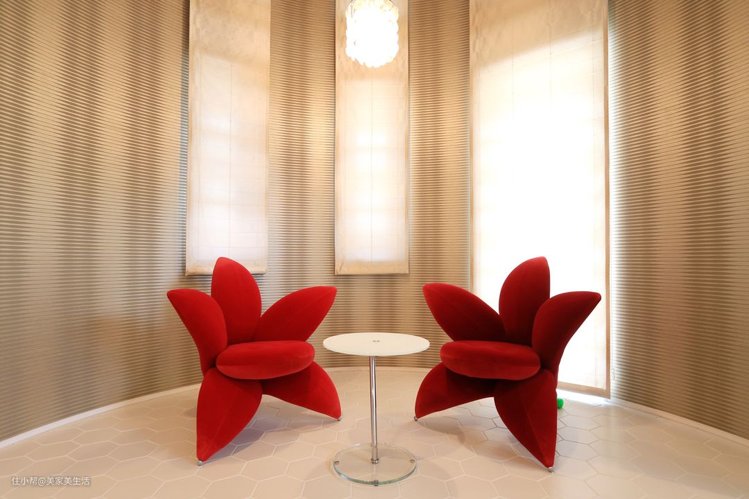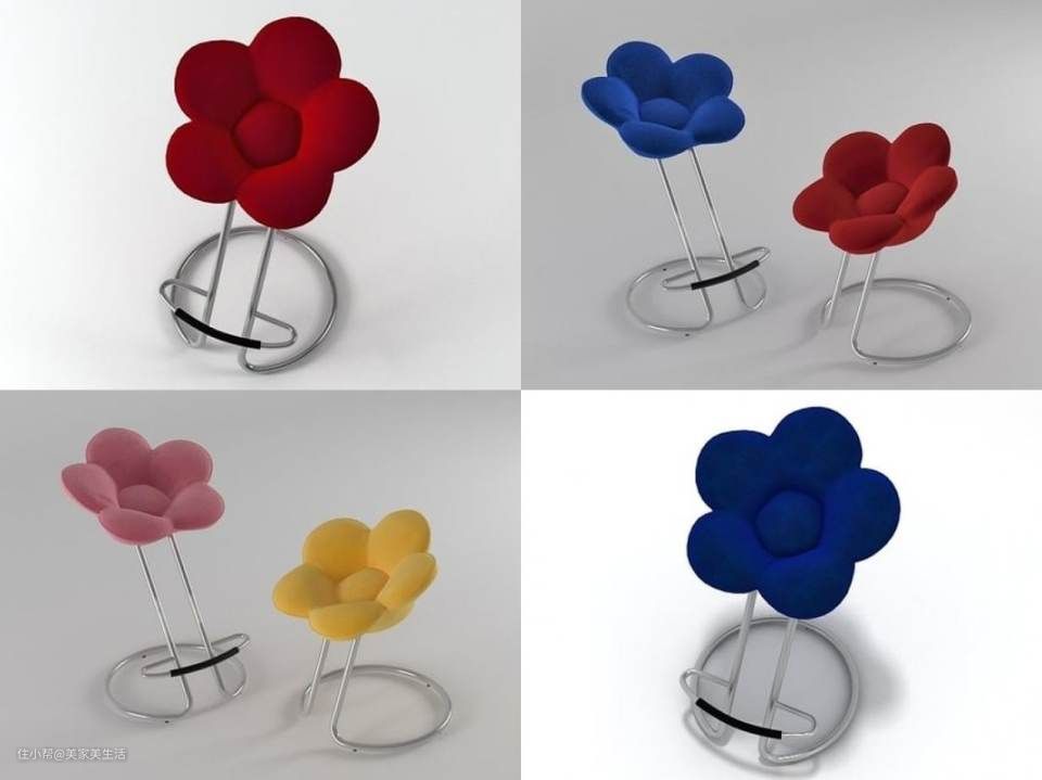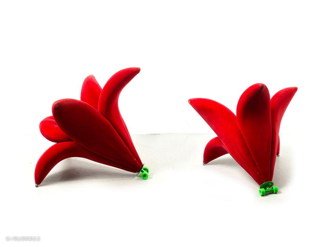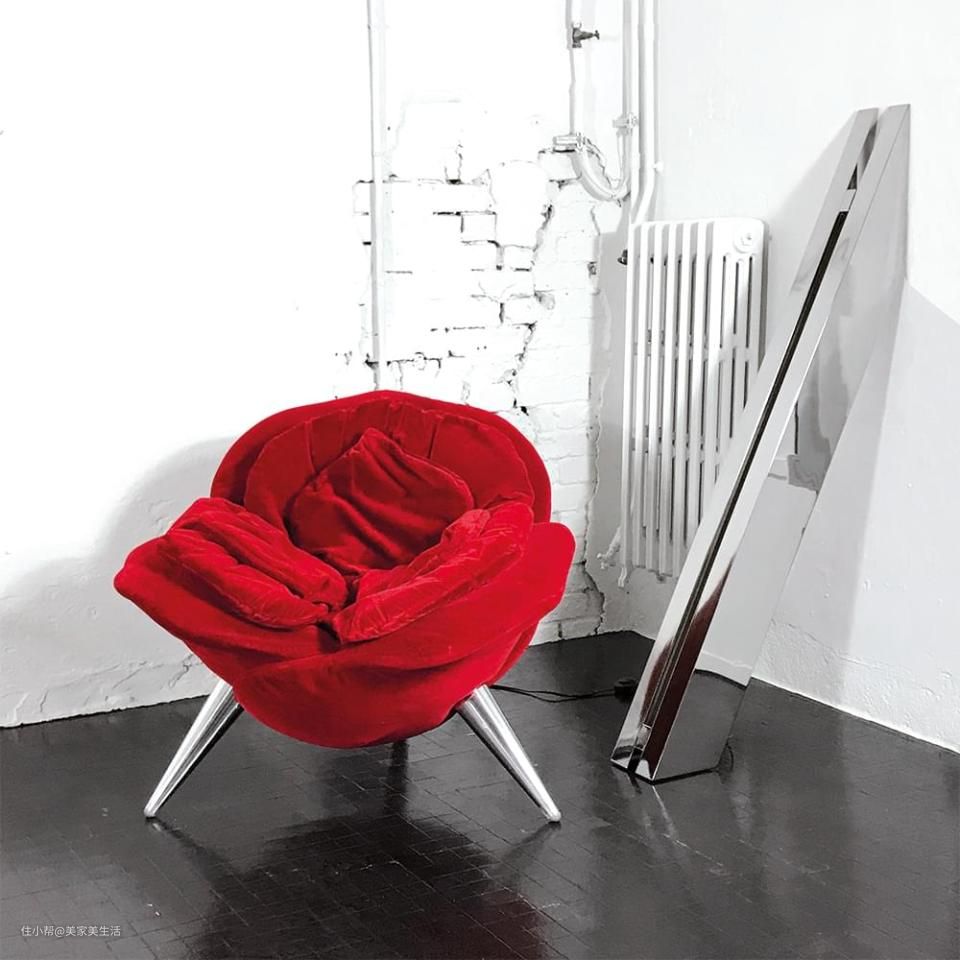 Rose Chair的玫瑰椅,颜色鲜艳亮丽,采用柔软舒适的天鹅绒面料作为饰面,既花色的艳丽,又有布艺单椅特有温和亲肤之感。花瓣层层堆叠,仿真度极高;三角支腿,增强其稳定性。